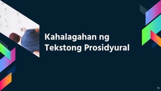 Sa tulong ng tekstong ito ang tao ay nakagagawa ng isang produkto o bagay at sa tulong nito natutunan ng isang indibidwal ang pagkakasunod-sunod ng mga hakbang na dapat gawin upang makabuo. Ang tekstong prosidyural ay gumagamit ng mga kaukulang hakbang upang mapagtagumpayan ang ibat ibang gawain Ilan sa mga mabubuting dulot nito ay ang mga sumusunod. TEKSTONG PROSIDYURAL Ang tekstong prosidyural ay isang uri ng paglalahad na kadalasang nagbibigay ng impormasyon at instruksyon kung paanong isasagawa ang isang tiyak na bagay.