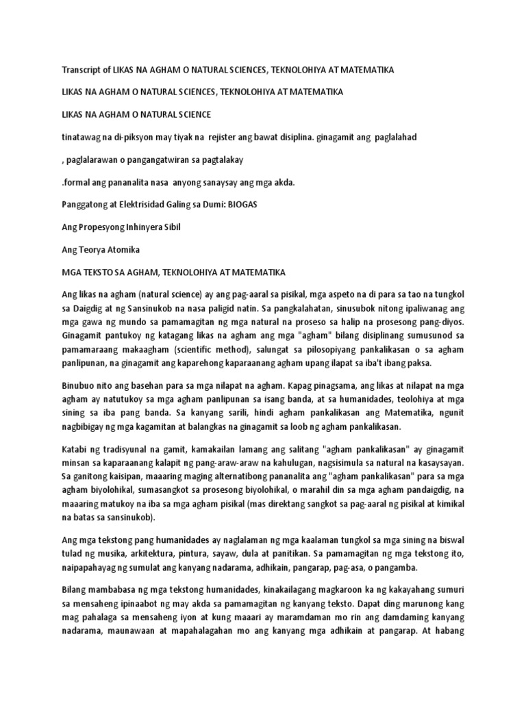 Ngayon ang epekto ng aktibidad ng tao sa kapaligiran ay kapansin-pansin. MGA TEKSTO SA AGHAM TEKNOLOHIYA AT MATEMATIKA TAPOS AGHAM O NATURAL SCIENCE tinatawag na di-piksyon may tiyak na rejister ang bawat disiplina. Mahalaga ang pag-aaral ng agham at teknolohiya sa lahat ng panahon dahil ito ang susi sa pag-unlad ng bansa.
