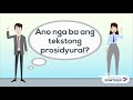 Thnk u po hazellovecleon Advertisement. Sets found in the same folder. Tekstong Prosidyural Ang tekstong prosidyural ay isang uri ng teksto tungkol sa serye ng mga gawain na may layuning makamit ang inaasahang hangganan o resulta.