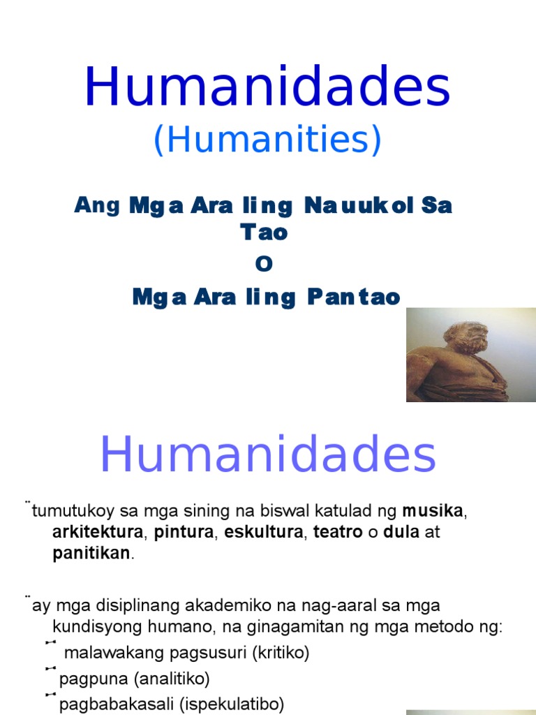 Ang Humanidades ay hango sa salitang Humanus na ang ibig sabihin ay tumulong sa tao. Ang panitikan ay pagpapahalaga ng mga damdamin ng tao higit sa mga bagay-bagay sa daigdig sa pamumuhay sa lipunan at pamahalaan at sa kaugnayan ng kaluluwa sa Bathalang Lumikha Literatura o Panitikan Sangay ng karunungan ang Humanidades na. Humanidades Humanities Ang Mg a Ara li ng Na uuk ol Sa Tao O Mg a Ara li ng Pan tao Humanidades tumutukoy sa mga sining na biswal katulad ng musika arkitektura pintura eskultura teatro o dula at panitikan.