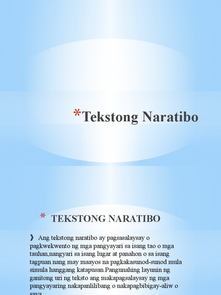Naratibo Pptx Tekstong Naratibo Layunin 1 Nailalahad Ang Kahulugan Katangian At Elemento Ng Tekstong Natalakay 2 Nauunawaan Ang Iba T Ibang Course Hero