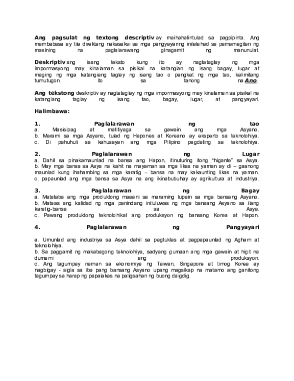 Tekstong deskriptiv ng bansa. Ngayon napakalaki ang pinagbago. Para sa akin mas hahangaan ko sana ang may akda kung nakapagbigay siya ng ilang halimbawa sa pangangalaga ng ating mundo. Indibidwal sa iyong sarili pamilya komunidad bansa at daigdig.