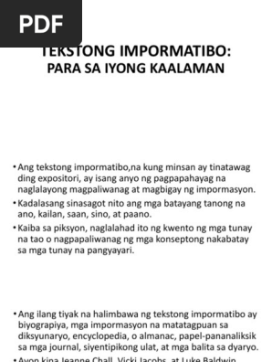 HALIMBAWA NG TEKSTONG IMPORMATIBO Sa paksang ito tatalkayin natin kung ano nga ba ang tekstong impormatibo. Ito ay nagbibigay ng mga impormasyong nakapagpapalawak ng kaalaman ay nagbibigay liwanag sa mga paksang inilalahad upang mapawi nang lubos ang pag -aalinlangan. Click again to see term.